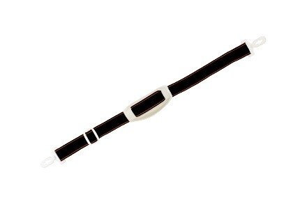 Jugular para Capacete em tecido elástico de látex e poliéster com presilhas em plástico rígido. Queixeira em PVC flexível com três orifícios.